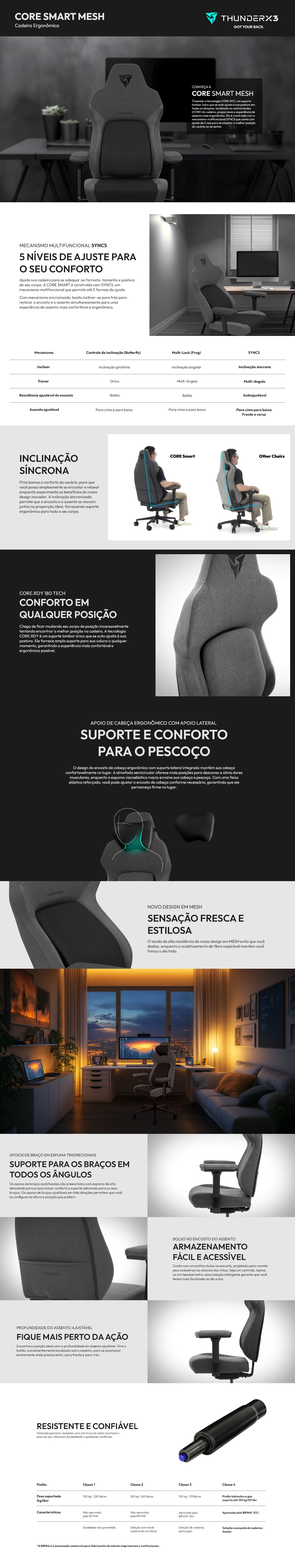 Além disso, o revestimentodo encosto em malha mesh respirável mantém a temperatura agradável, permitindo que você permaneça confortável durante todo o uso. Sua estrutura de nylon resistente, combinada com a base de aço, assegura durabilidade e confiabilidade, tornando a ThunderX3 CORE Smart a escolha ideal para quem busca qualidade premium.
